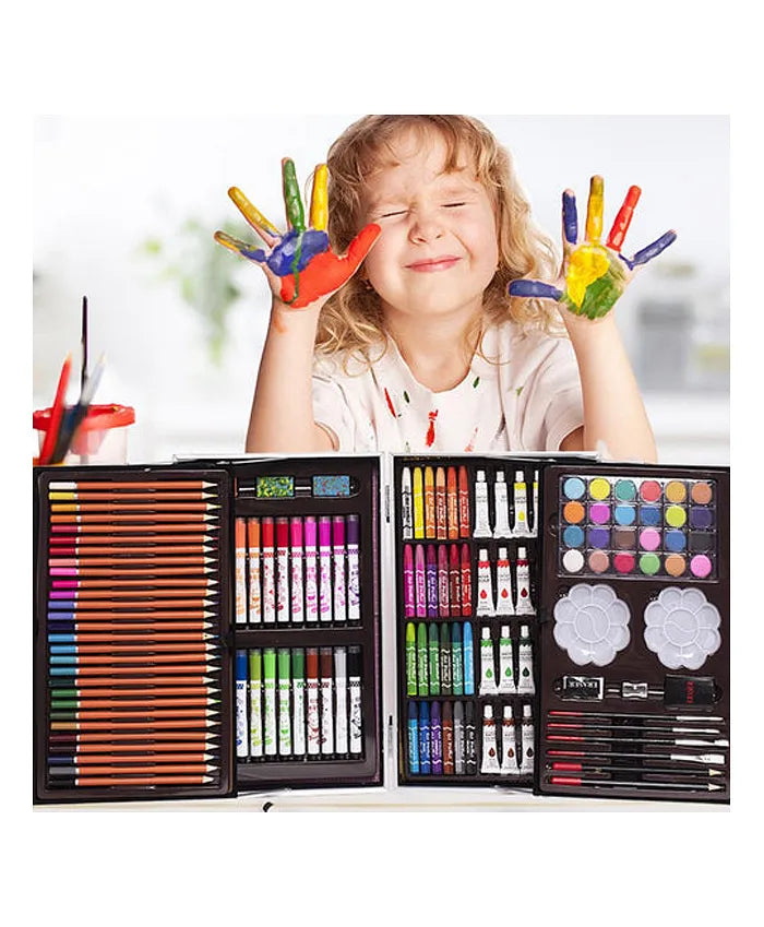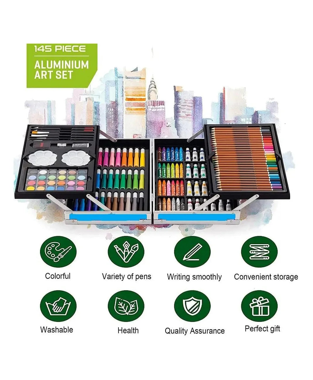 145 Pieces Complete Set β Includes pencils, markers, oil pastels, watercolor cakes, brushes & more.